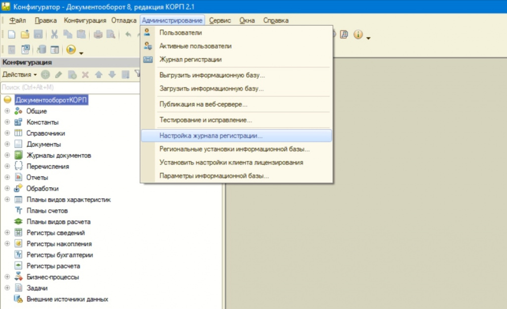 В Конфигураторе открыть меню «Администрирование», в выпадающем списке выбрать «Настройка журнала регистрации».