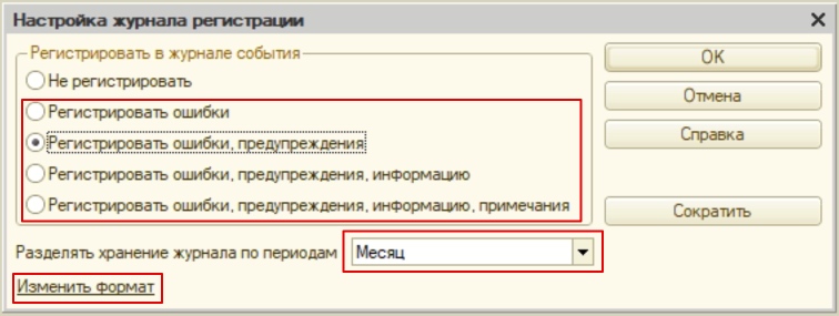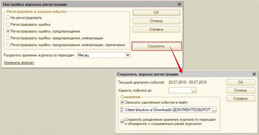 Только надо учесть, что объем, который занимает на диске журнал регистрации, достаточно большой. Поэтому имеет смысл выделить для него специальное хранилище. В том же окне есть команда «Сократить». С ее помощью пользователь может переносить ранее зафиксированные события в архив или удалять те данные, которые уже не нужны.