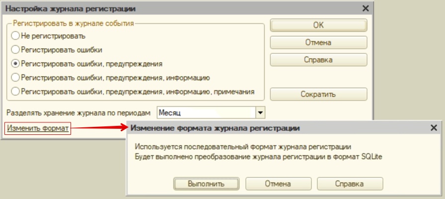 Там же можно установить периоды разделения журнала. Система будет разбивать его на отдельные файлы, где перечислены события за заданный период времени (неделю, месяц или год). Это упрощает администрирование и хранение информации. В том же окне меняется формат данных журнала регистрации с текстового (по умолчанию) на легкий и современный SQLite.