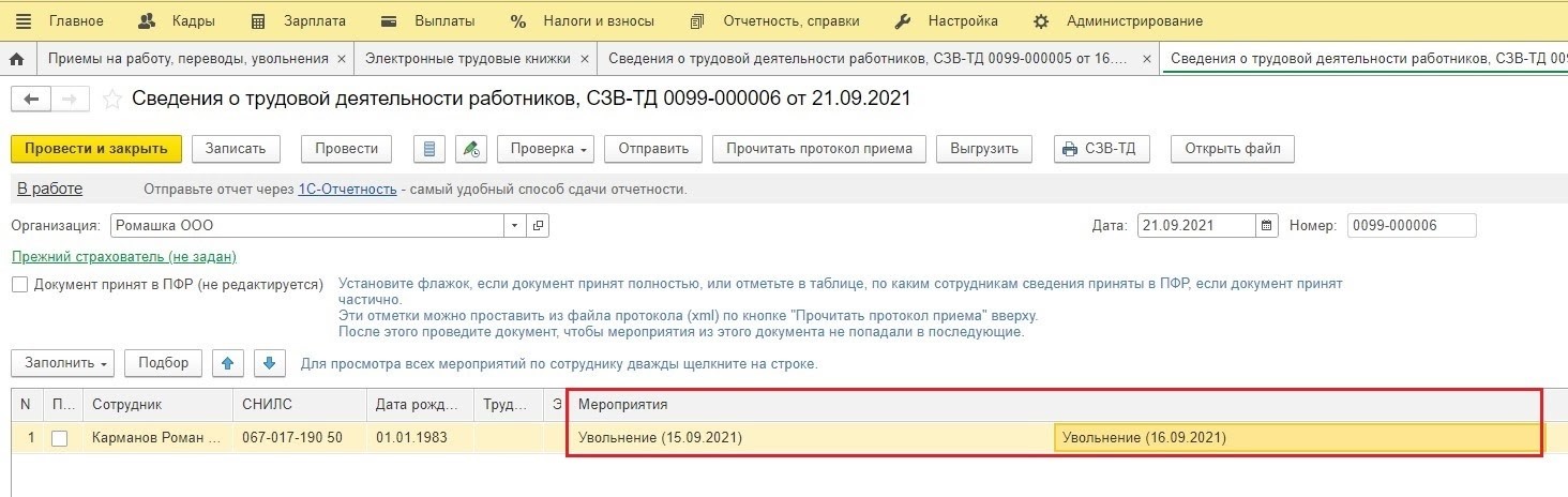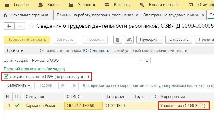Но в данной ситуации есть небольшая проблема. Обязательно должно пройти создание и отметка отчета СЗВ-ТД с изначальным кадровым мероприятием, что он принят Пенсионным фондом и не редактируется.