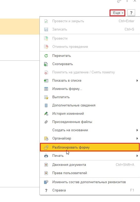 Для подготовки отменяющего отчета СЗВ-ТД нужно отменить проведение документа «Увольнение», потом поставить в нем правильную дату и провести документ снова. Чтобы отменить документ, надо разблокировать его по кнопке «Еще» в правом углу.