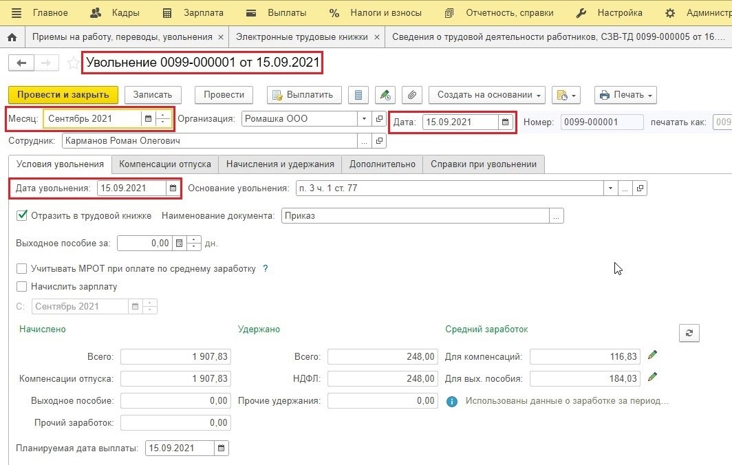 После этого надо исправить информацию — в примере заменить дату увольнения на 15 сентября. После этого документ нужно снова провести.