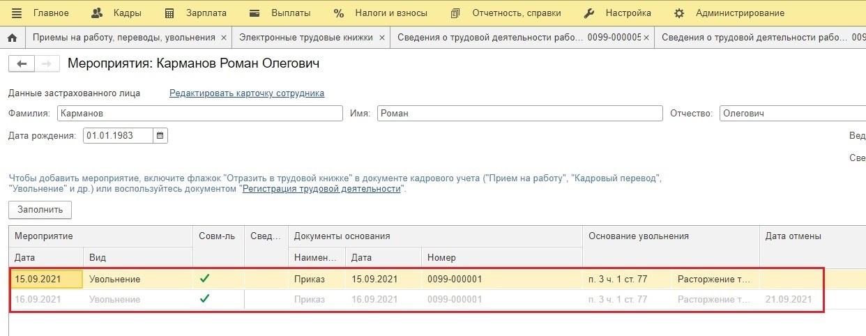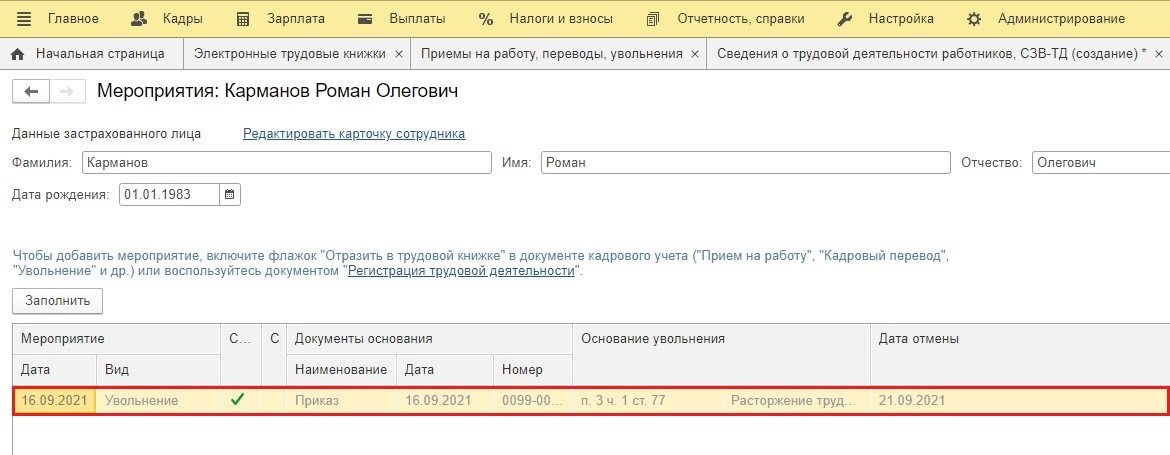 Работник уволен 15 сентября 2021 года. Позже обнаружилось, что кадровик неверно указал дату увольнения — 16 сентября и сдал отчет СЗВ-ТД. Для этого он заходил в меню «Отчетность, справки» и переходил в «Электронные трудовые книжки».