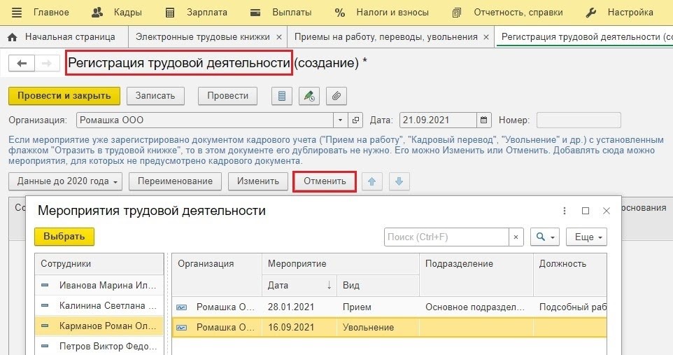 Кроме того, данный метод подходит в ситуации, когда требуется отменить мероприятие «Увольнение» или «Прием». Тогда всего лишь нужно распровести кадровый документ.