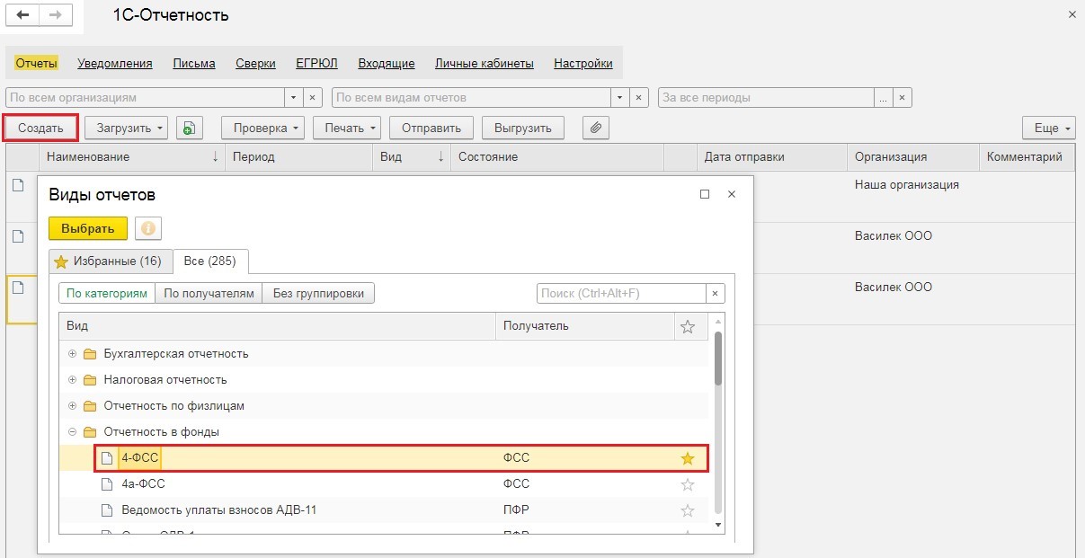 Если используется 1С:Бухгалтерия, нужно зайти в раздел "Отчеты", а если 1С:ЗУП - в раздел "Отчетность, справки". После этого также выбирается раздел "Регламентированные отчеты" или "1С-Отчетность". Откроется новое окно, в котором нужно нажать кнопку "Создать" и выбрать "4-ФСС".