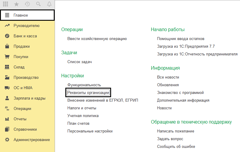 Перед печатью необходимо создать печатную форму и ввести необходимые реквизиты, которые могут быть обязательные, например, подписи ответственных лиц. Настройки для таких реквизитов можно установить по умолчанию для вывода в печатную форму. Для этого следует заполнить сведения об организациях, перейдя по ссылкам «Главное» - «Реквизиты организации».