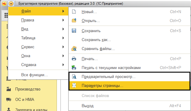 В разделы «Предварительный просмотр» и «Параметры страницы» можно перейти через главное меню «Файл», находясь в печатной форме документа. Пример рисунок №10.