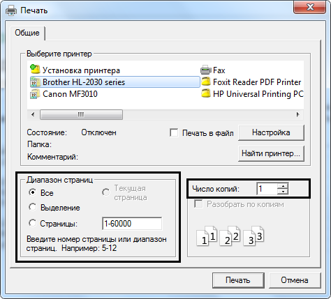 После введения всех необходимых параметров печати и изменения настроек документа, нужно выбрать принтер для печати, задать необходимое количество экземпляров и диапазон страниц. Последний параметр изменяется в случаях -при необходимости вывода на печать 1 страницы или нескольких страниц из одного документа. Для этого в разделе «Диапазон страниц» стоит выбрать «Текущая страница» или «Страницы», перечислить номера страниц через запятую и/или дефис.
