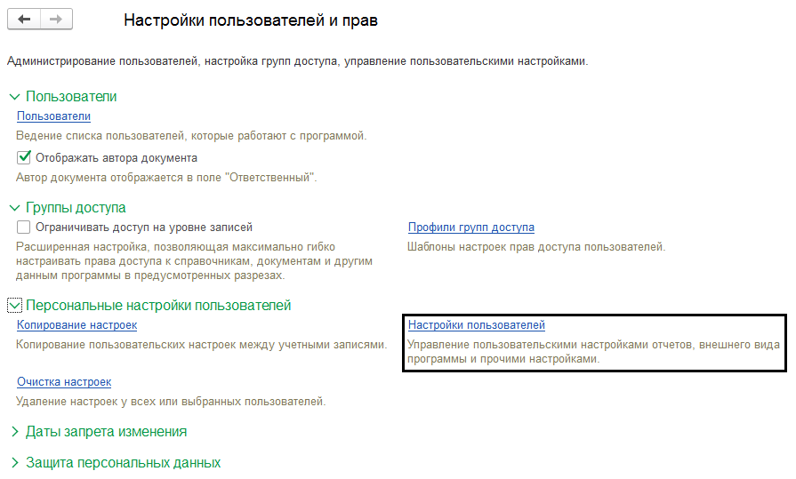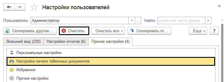 Изменение принтера пользователя после переустановки. Система автоматически выбирает для печати принтер, на который ранее уже производилась печать. Для исправления этой ошибки можно попробовать выбрать другой принтер перед печатью документа, но такой вариант не всегда эффективен. В случае, когда первый вариант не подходит, следует сбросить настройки, выбрав в «Меню» следующий путь: «Администрирование», «Настройки пользователей и прав», «Настройки пользователей», «Прочие настройки», «Настройки печати табличных документов», «Очистить». (пример рисунки №13,№14 и №15)