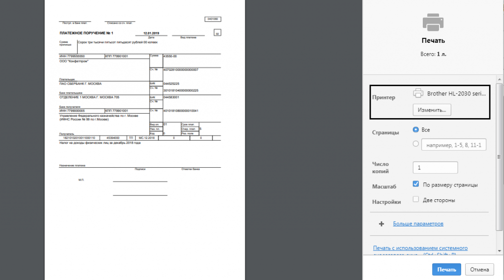Еще один вариант ошибки — сохранение документа в формате PDF, а не вывод на печать, при работе в браузере. Такая ошибка может возникнуть при отсутствии подключения принтера. Для исправления проблемы, требуется изменить настройки в браузере перейдя в раздел «Печать» или «Предварительный просмотр», далее в «Изменить» и указать нужный принтер. Пример на рисунке №16.