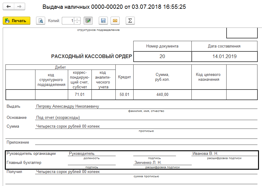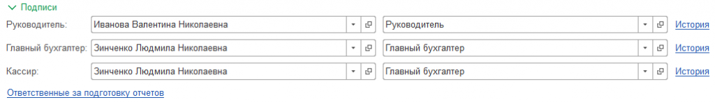 В разделе «Подписи» указываются данные руководителя, кассира и главного бухгалтера. При изменении ответственных лиц в организации всю информацию действий можно проследить перейдя в раздел «История». Например, при необходимости вывода одного документа на печать под разными датами и за подписями разных ответственных лиц.