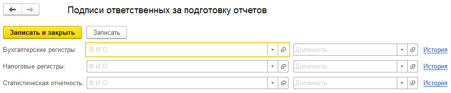 Для автоматического заполнения данных ответственных лиц за подготовку отчетов, следует ввести все необходимые параметры в разделе «Ответственные лица за подготовку отчетов».