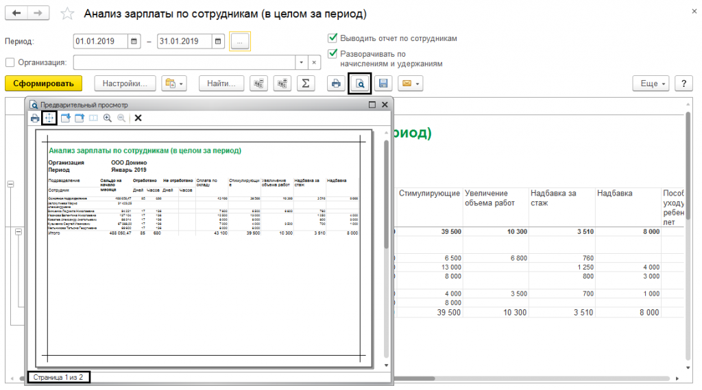 Для избежания ситуации, при которой на печати таблица делит документ на несколько листов, следует воспользоваться кнопкой «Предварительный просмотр документа». При ее нажатии, появляется окно с итоговым расположением таблицы на бумаге. Пример на рисунке №6. Внизу окна указывается количество страниц документа.