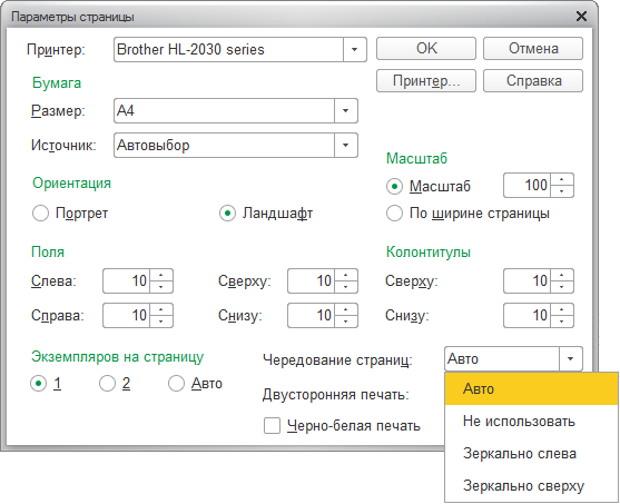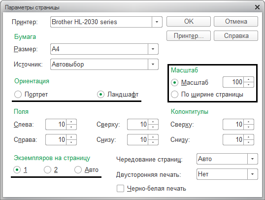 Печать табличного документа 1С. Параметры печати
