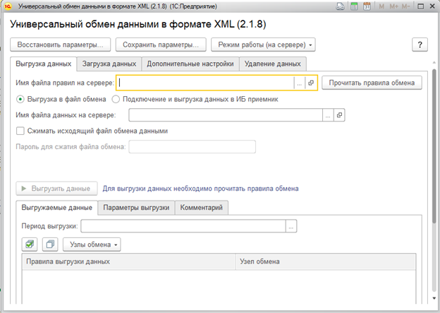 В "Выгрузке данных" расположено поле выбора файла правил обмена информацией. В таком случае обмен осуществляется между двумя разными базами, а правила применяются от самого разработчика. Они представляют из себя соответствие справочников и регистров обеих баз, что объясняется возможной разной информацией на двух базах.