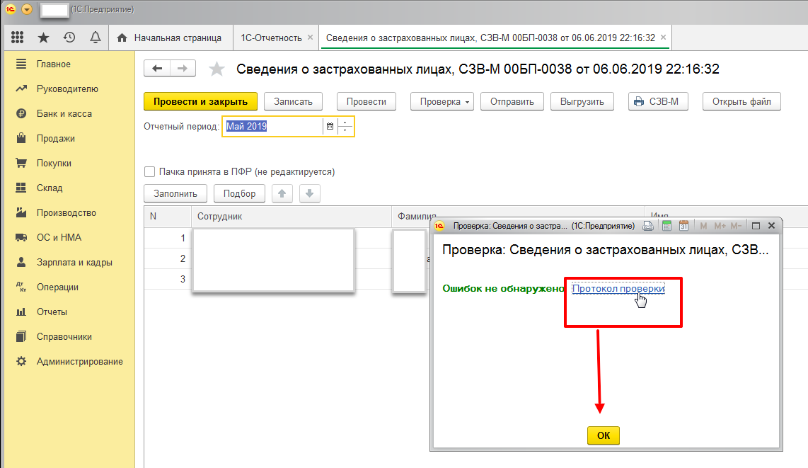 После того, как вы тщательно изучили протокол, можно его закрыть. Далее убираем окно проверки. Настало время отослать отчет в ПФР. Для этого нажимаем на кнопку «Отправить». Появится необходимость подтверждения корректного заполнения отчета. Ставьте галочку на «Да», после чего нажимайте «Отправить».