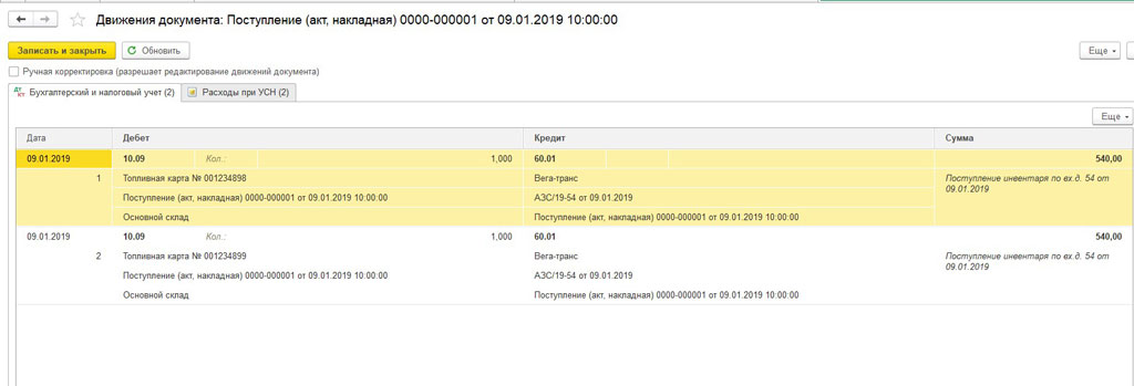 Разрешено отражать покупку карт топливных через поступление услуг с применением ручного учета карт на счете забалансовом 006 по субконто «Бланк строгой отчетности» и «Склад». Если в качестве склада отражать машину, то карта во 2 варианте учета будет привязана к автотранспорту.
