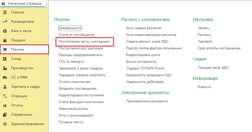 В открывшейся вкладке требуется кликнуть «Поступление» и выбрать из выпадающего перечня «Услуги (акт)». Далее заполнить документ сведениями из полученного акта.