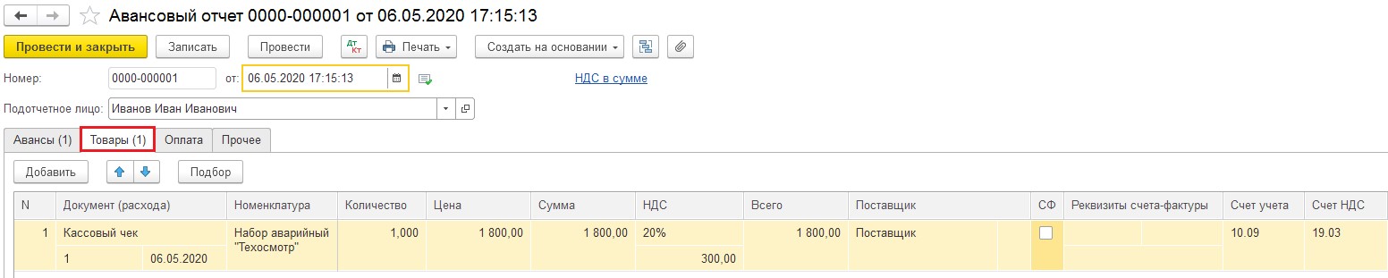 Если покупка отображается авансовым отчетом, то приобретаемый инвентарь показывается в разделе «Товары», как показано на картинке.