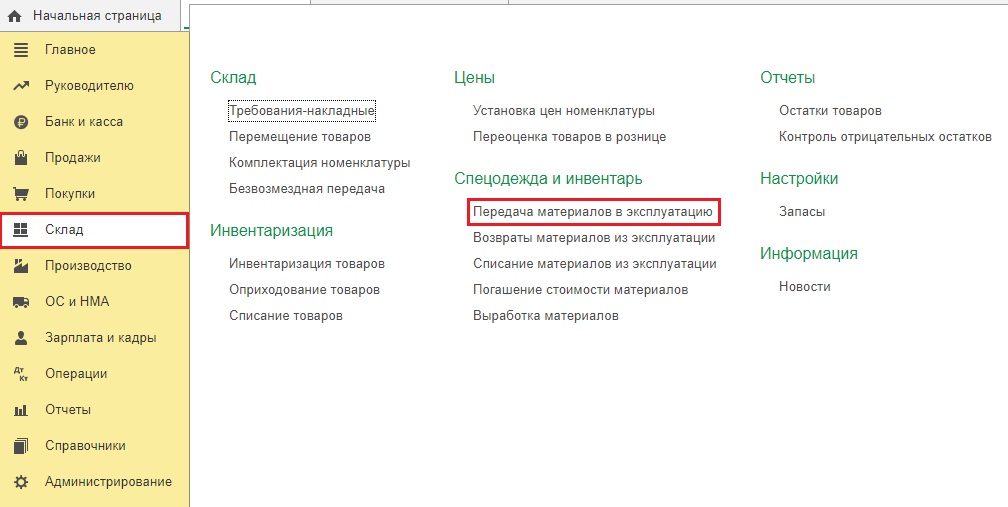 Для этого нужно зайти во вкладку «Склад» и выбрать «Передача материалов в эксплуатацию».