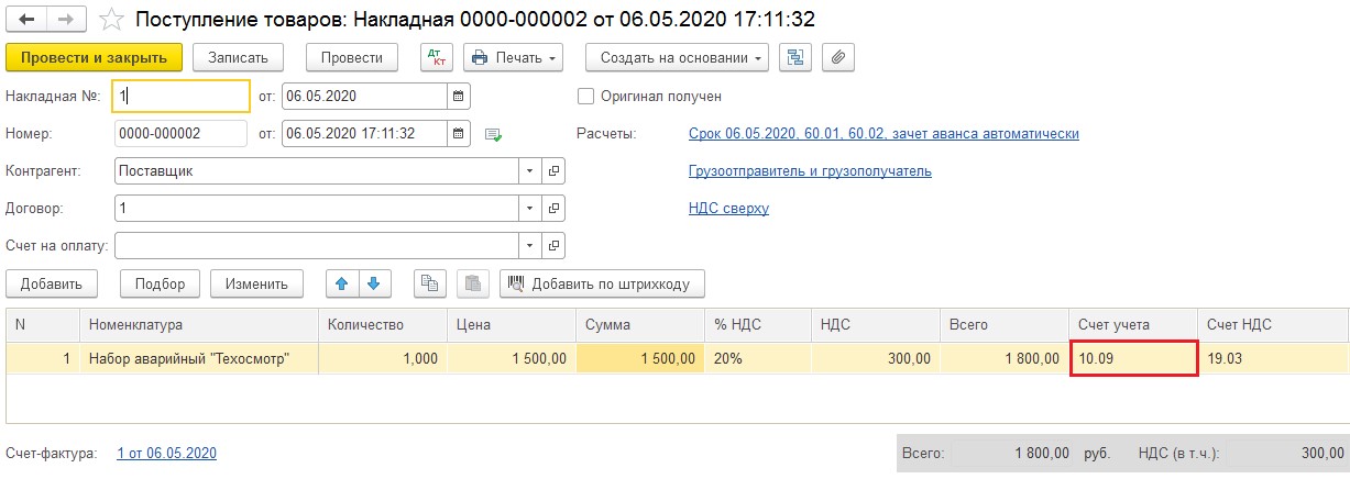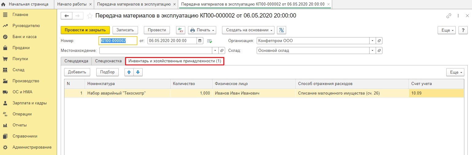 При проведении документ оформит проводки: Дт 26 Кт 10.09, а также отразит этот инвентарь на вспомогательном счёте МЦ.04, чтобы затем получилось сделать пересчет инвентаря в компании.