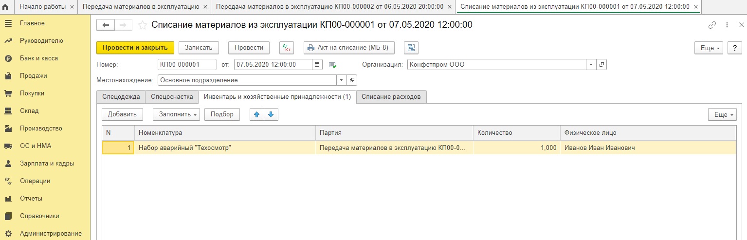 Когда нужно будет списать инвентарь с забалансового учета, понадобится ввести документ «Списание материалов из эксплуатации», основываясь на ранее внесенном «Передача материалов в эксплуатацию» или создав новый в категории «Склад».