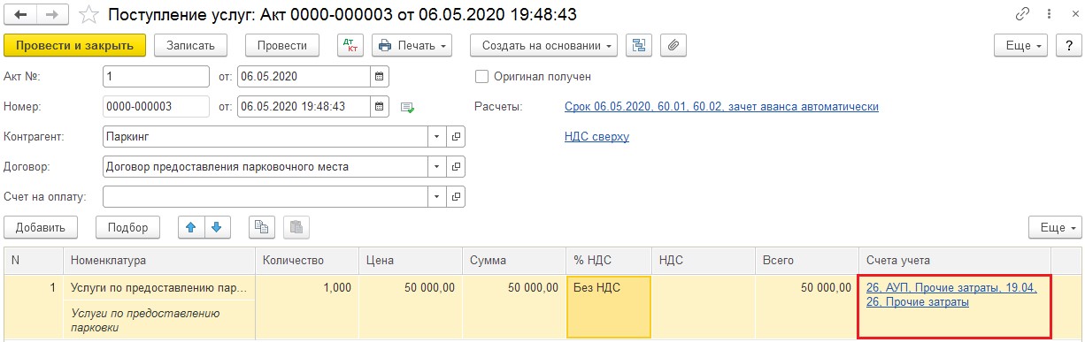 Акт об оказании услуги, который паркинг должен вам направить, вносится в программу в категории «Покупки» - «Поступление (акты, накладные)».
