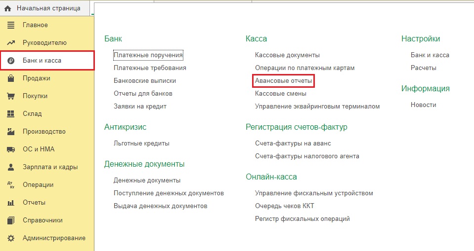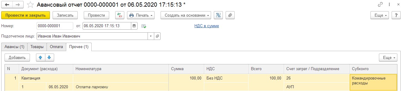 Если в бухгалтерию поступили квитанции, сообщающие об оплате парковки для служебной машины командировочным работником, в программу нужно внести «Авансовый отчёт» в категории «Банк и касса».