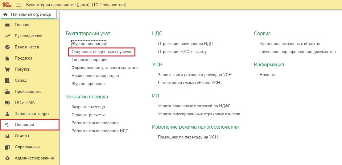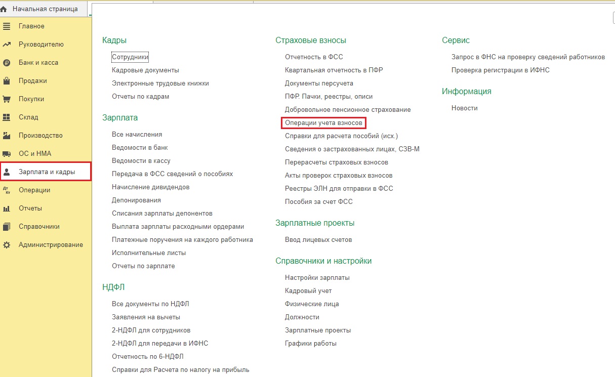 Для этого зайдем во вкладку «Зарплата и кадры» и выберем строку «Операции учёта взносов».
