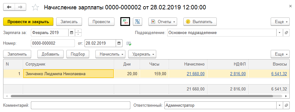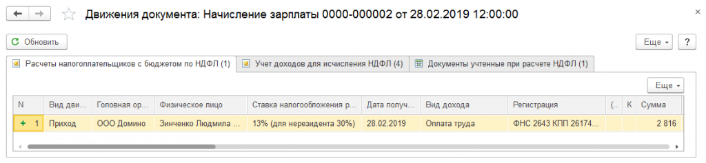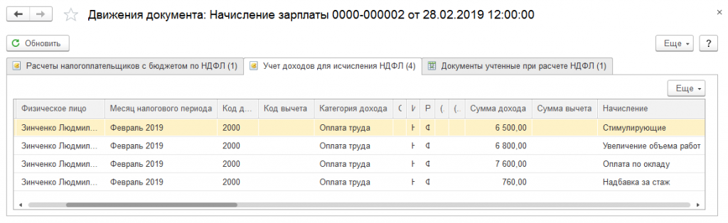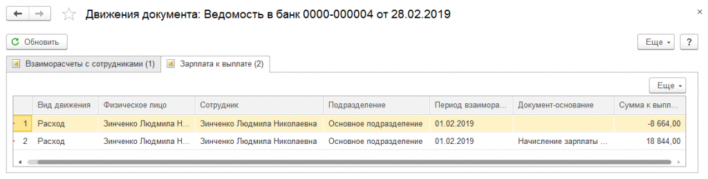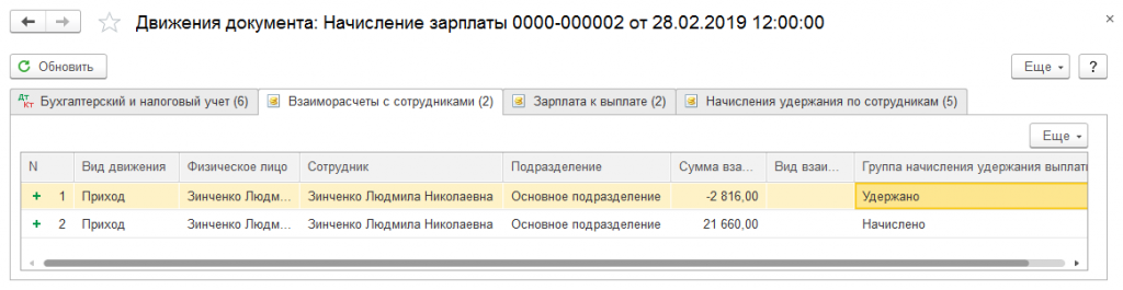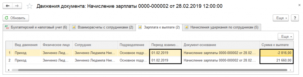 Расчетный регистр «Зарплата к выплате» содержит основные данные. Например, в феврале после проведения документа «Начисление зарплаты» появилось две строки. Это «Приход на сумму начисленной заработной платы» и «НДФЛ».