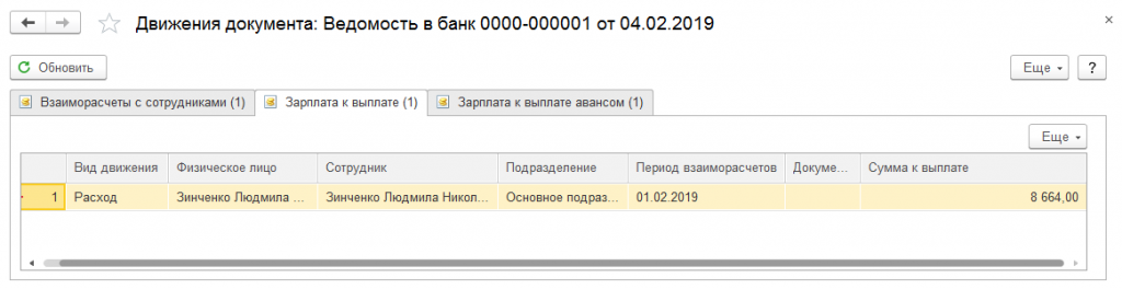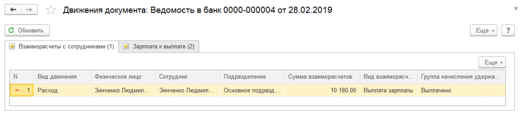 На основании «Ведомости в банк» были выплачены авансы. После проведения платежей изменяется регистр «Зарплата к выплате». Появляются новые записи «Расход», соответствующие суммам выплаченных авансов, уменьшается задолженность перед сотрудниками.