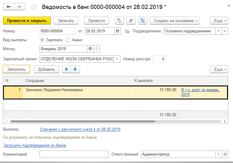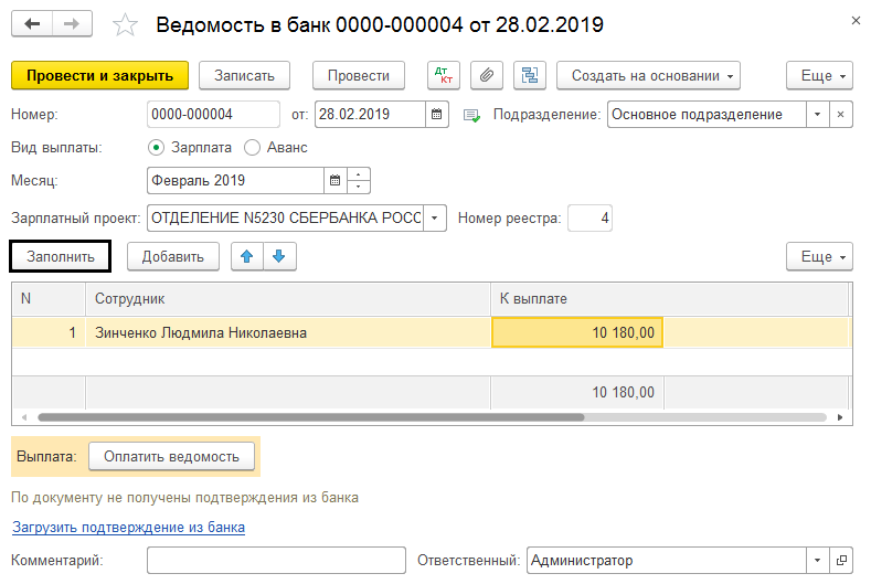 Для автоматического расчета итоговых сумм к выплате составляется «Ведомость в банк». После выбора опции «Заполнить» 1С:Бухгалтерия использует данные соответствующих регистров и указывает суммы, подлежащие выплате.