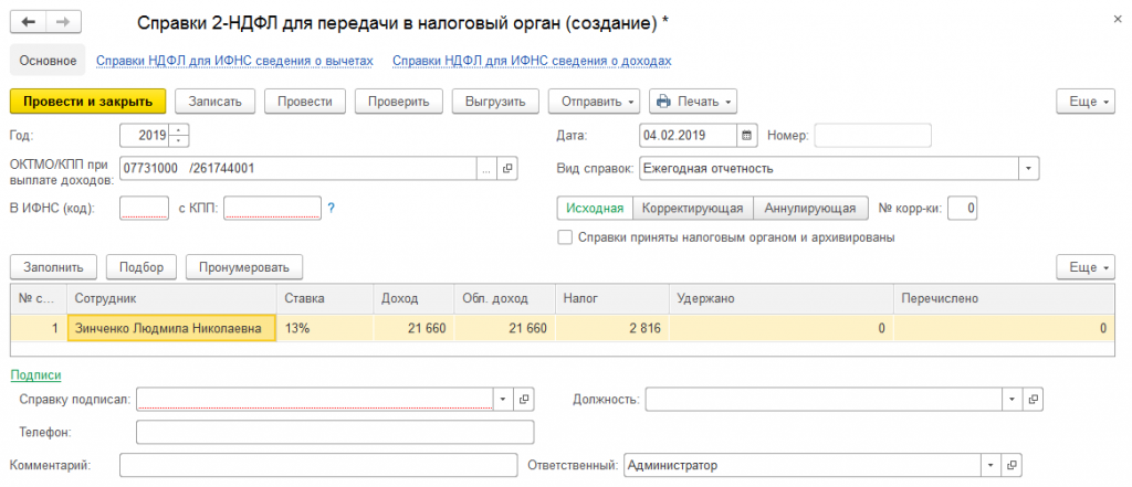 Упорядоченная информация используется для формирования справок, аналитических и налоговых отчетов. Например, чтобы составить «Справку 2-НДФЛ для передачи в ИФНС», необходимо открыть соответствующий пункт меню. Возможны два варианта – «Отчеты», «1С-Отчетность», «Регламентированная отчетность», или альтернативный «Зарплата и кадры», «НДФЛ». Готовый вариант содержит уже известную информацию – начисления зарплаты 21660 руб. и НДФЛ 2816 руб. Не отражены операции по удержаниям и перечислениям.