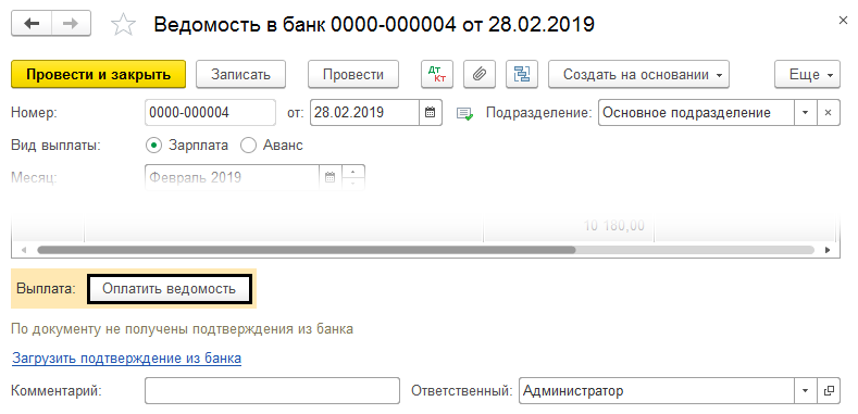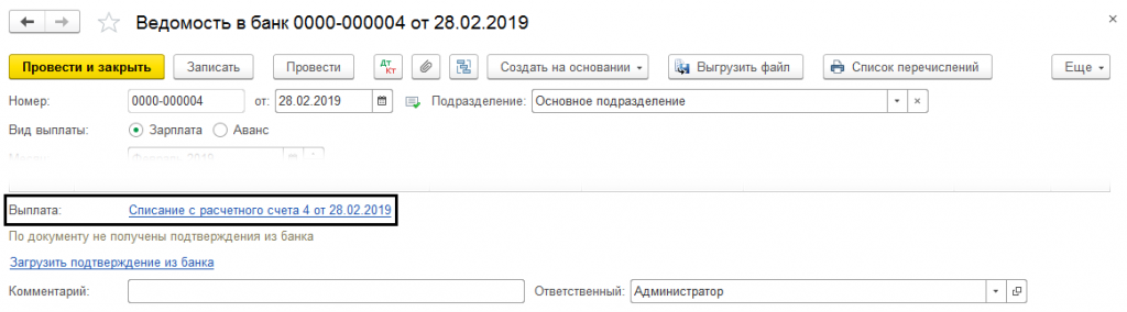 Для оплаты ведомостей используется отдельный вид документов «Списание с расчетного счета».