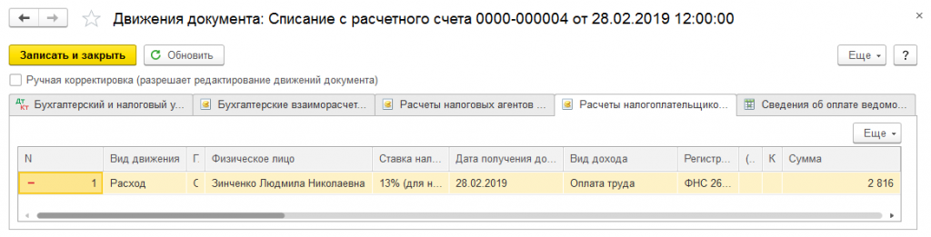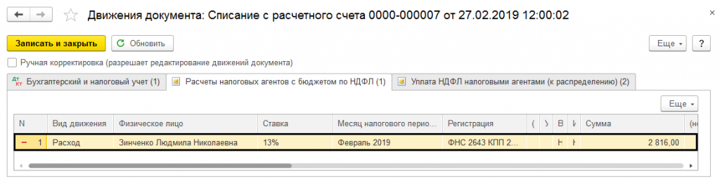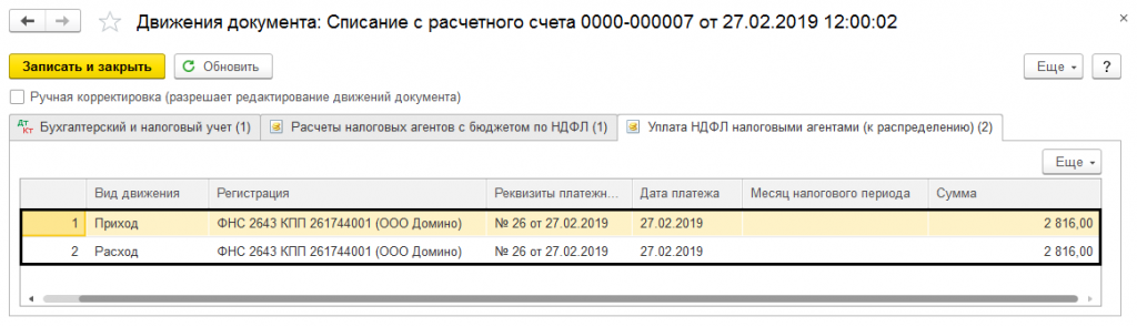 Эти платежи – основание для внесения данных в соответствующие регистры. После проведения «Списания с расчетного счета» изменяются данные строк «Расход» в «Расчетах налогоплательщиков с бюджетом по НДФЛ».