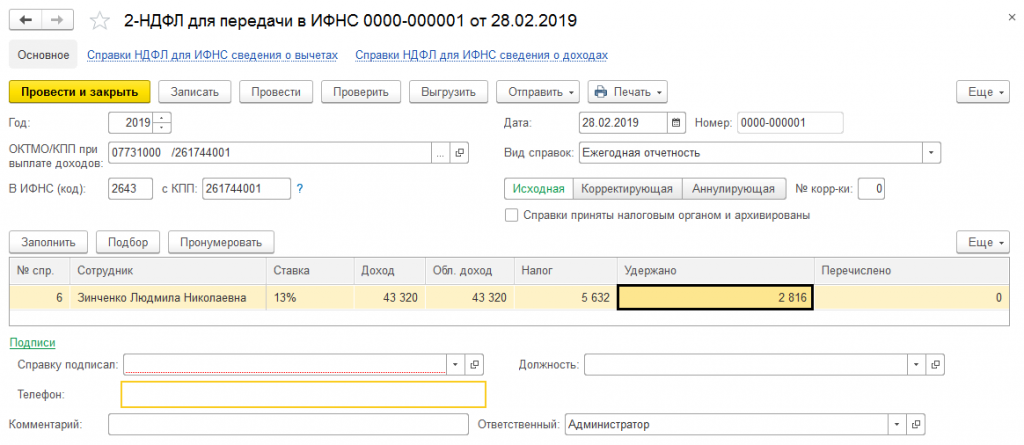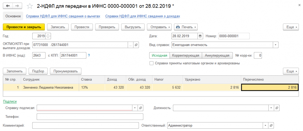 Откройте сформированные «Справки 2-НДФЛ для передачи в ИФНС». Суммы перечисленных налогов должны корректно отразиться в отчетах.