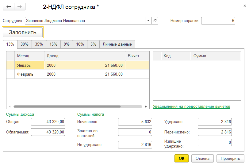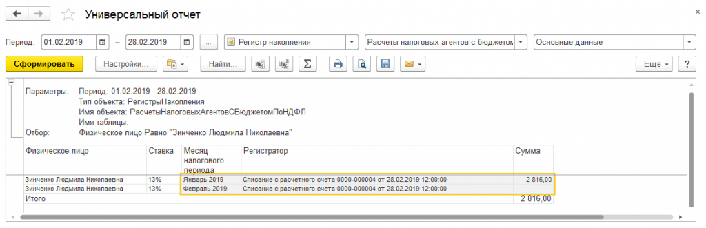 После проведения «Списания с расчетного счета», если составить «Справку 2-НДФЛ для передачи в ИФНС», то в графе «НДФЛ удержанный» возникнут перечисленные суммы.