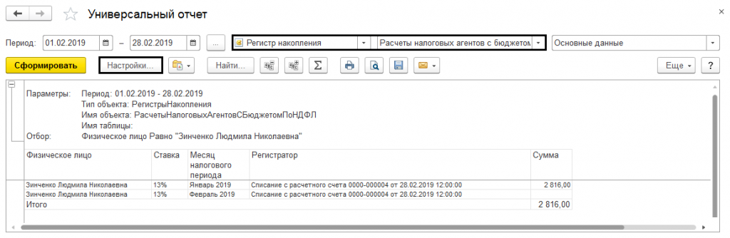 Отчет «Расчеты налоговых агентов с бюджетом по НДФЛ» оптимален для проверки корректности операций. Например, может оказаться, что февральское «Списание с расчетного счета» относится к январскому перечислению НДФЛ. В действительности документ отражает уплату НДФЛ за февраль. Следует проанализировать, почему нет проводок по НДФЛ за январь.