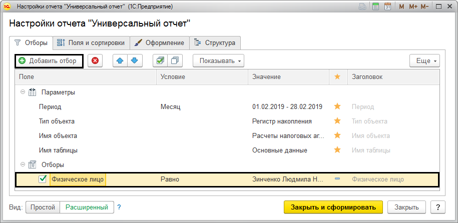 Для выбора любого доступного элемента предназначена опция «Отбор». Чтобы внести новый параметр, например, «Физическое лицо», используется опция «Добавить отбор».