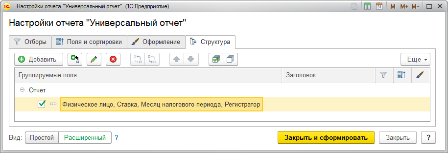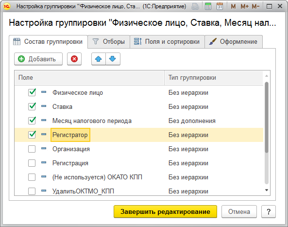 Чтобы изменить степень детализации, для добавления или удаления полей используются галочки. Если в списке по умолчанию нет необходимого параметра, нажимается кнопка «Добавить». Для вывода данных о документах-основаниях отмечается пункт «Регистратор».