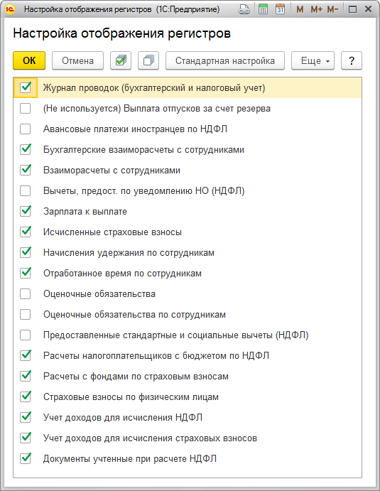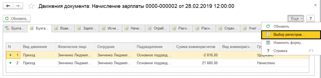 В открывшемся окне можно увидеть записи регистров расчета. Возможна настройка отображения или скрытия отдельных регистров. Эта опция регулируется после нажатия кнопки «Еще».