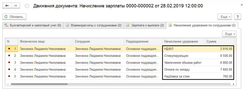 Вид регистра «Начисления удержания по сотрудникам» включает все возможные виды расчетов.