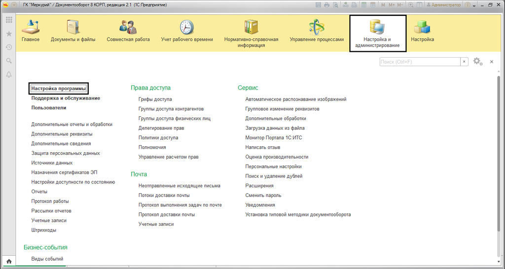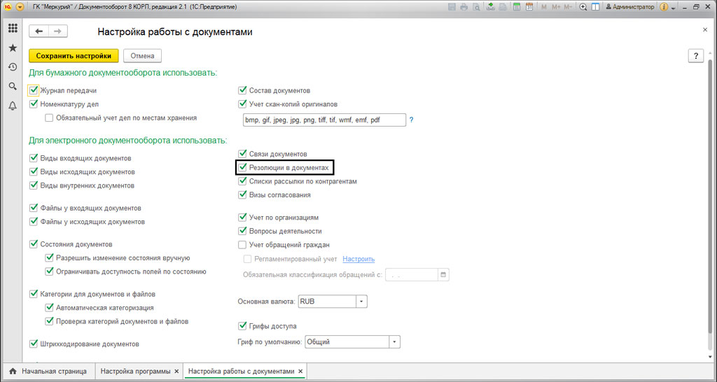 Для того, чтобы резолюция была доступна в программе, перед этим нужно установить специальную галочку в настройках программы. Для этого, перейдите в раздел "Настройки и администрирование", после чего нажимаем на "Настройки программы", выбираем "Делопроизводство".