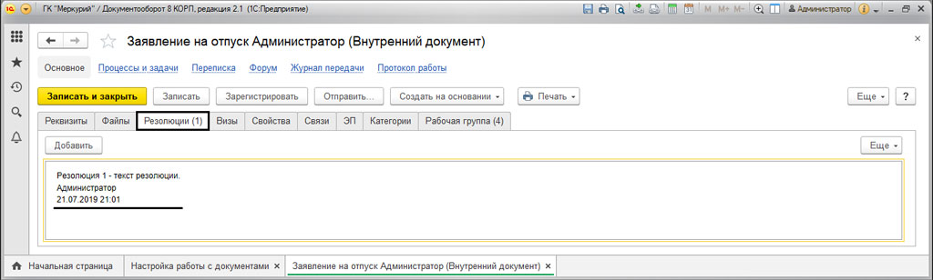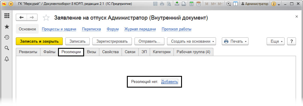 Если выбрать эту установку, то в документах появиться новая функция, а именно "Резолюция". Теперь если пользователь нажмет на гиперссылку "Добавить", то он сможет внести резолюцию к документу.