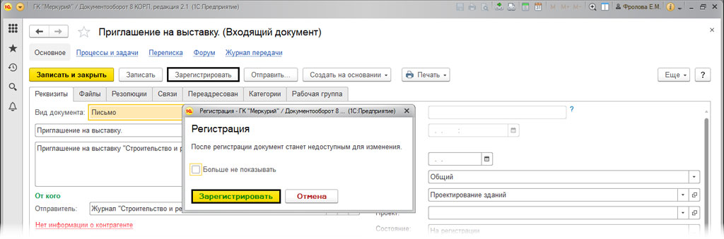 После того, как вы заполните все нужные поля. Вам нужно зарегистрировать ваш документ. Для этого, нажимаем на кнопку "Зарегистрировать". В следующем окне повторяем наши действия. После регистрации документа, запрещается вносить изменения.