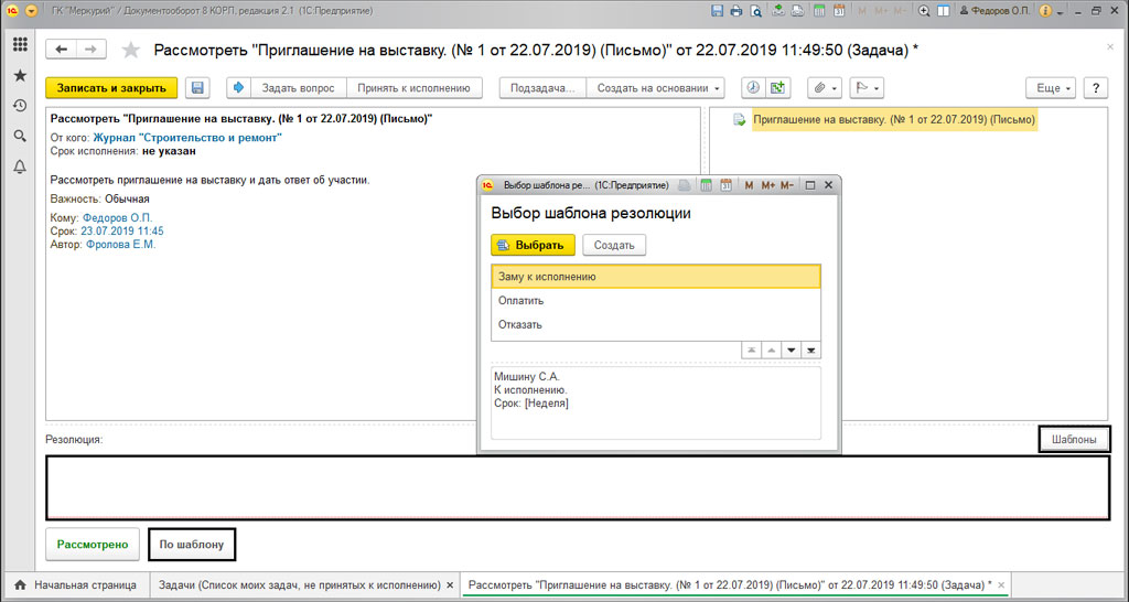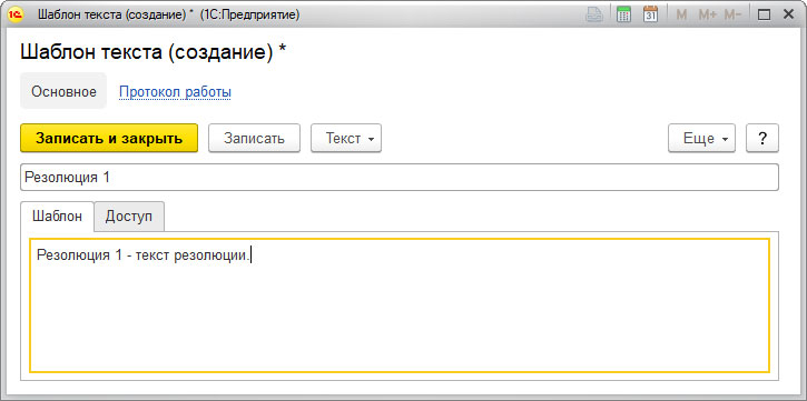 При нажатии на кнопку создать, пользователь сможет внести свои резолюции. Благодаря шаблонам, пользователь сможет быстрее работать с документами.