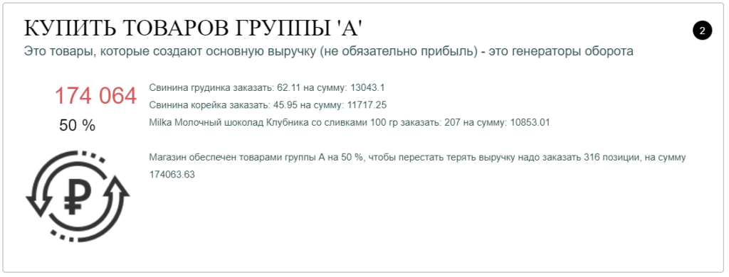 Товары группы "А". Эта группа товаров приносит львиную часть выручки торговой точки. Из отчета становится ясно, что тут была допущена оплошность. Программа описывает сложившуюся ситуацию достаточно простым и понятным языком. Не большого массива информации, программа дает ясные и четкие указания для решения проблемы с товарами группы "А".