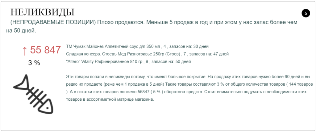 Товары - неликвиды. Им не место в ассортименте торговой точки. Продаются очень редко. Нужно срочно избавляться.
