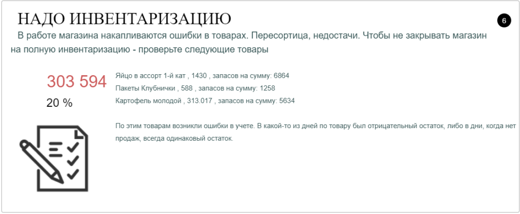 Необходимо срочно проводить инвентаризацию.  Пересортица, ошибки в товарных позициях. Если вовремя не остановить ком проблем, можно потерять весь учет на предприятии.