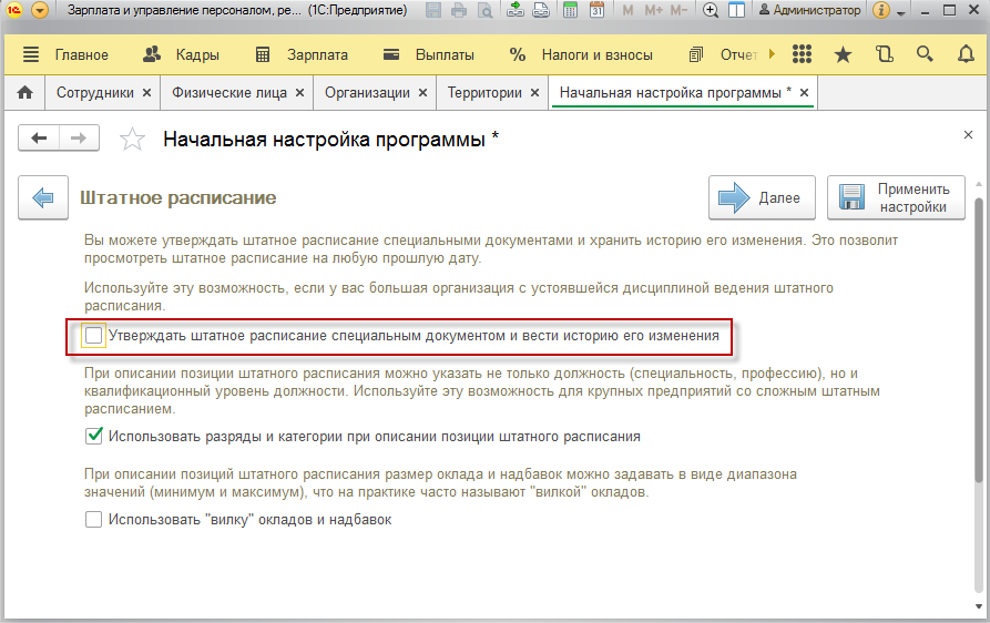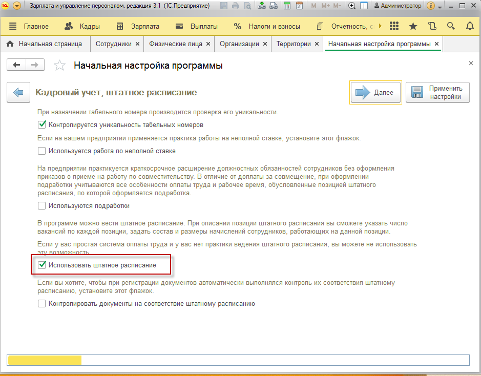 Когда любая программа 1С открывается в первый раз, происходит запуск «Стартового помощника». При этом, у пользователя сразу появляется возможность первоначально настроить соответствующим образом информационную базу, что производится посредством простой установки соответствующих флажков. Одной из часто используемых функций программы является активация нового штатного расписания с последующей настройкой и вводом необходимых данных для его ведения.